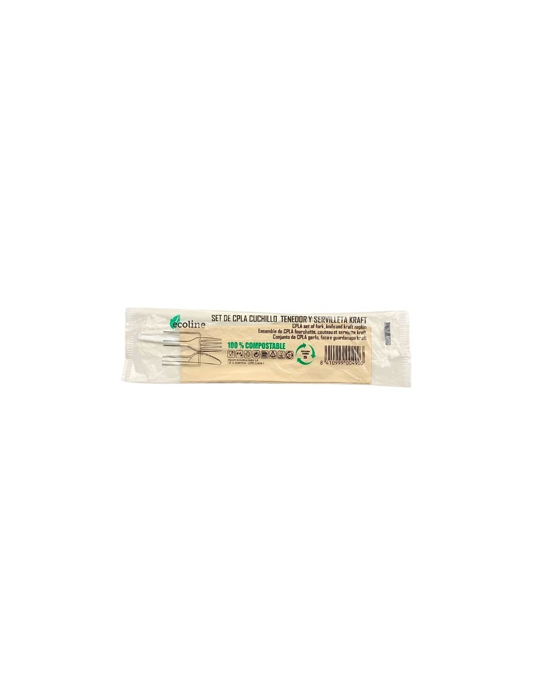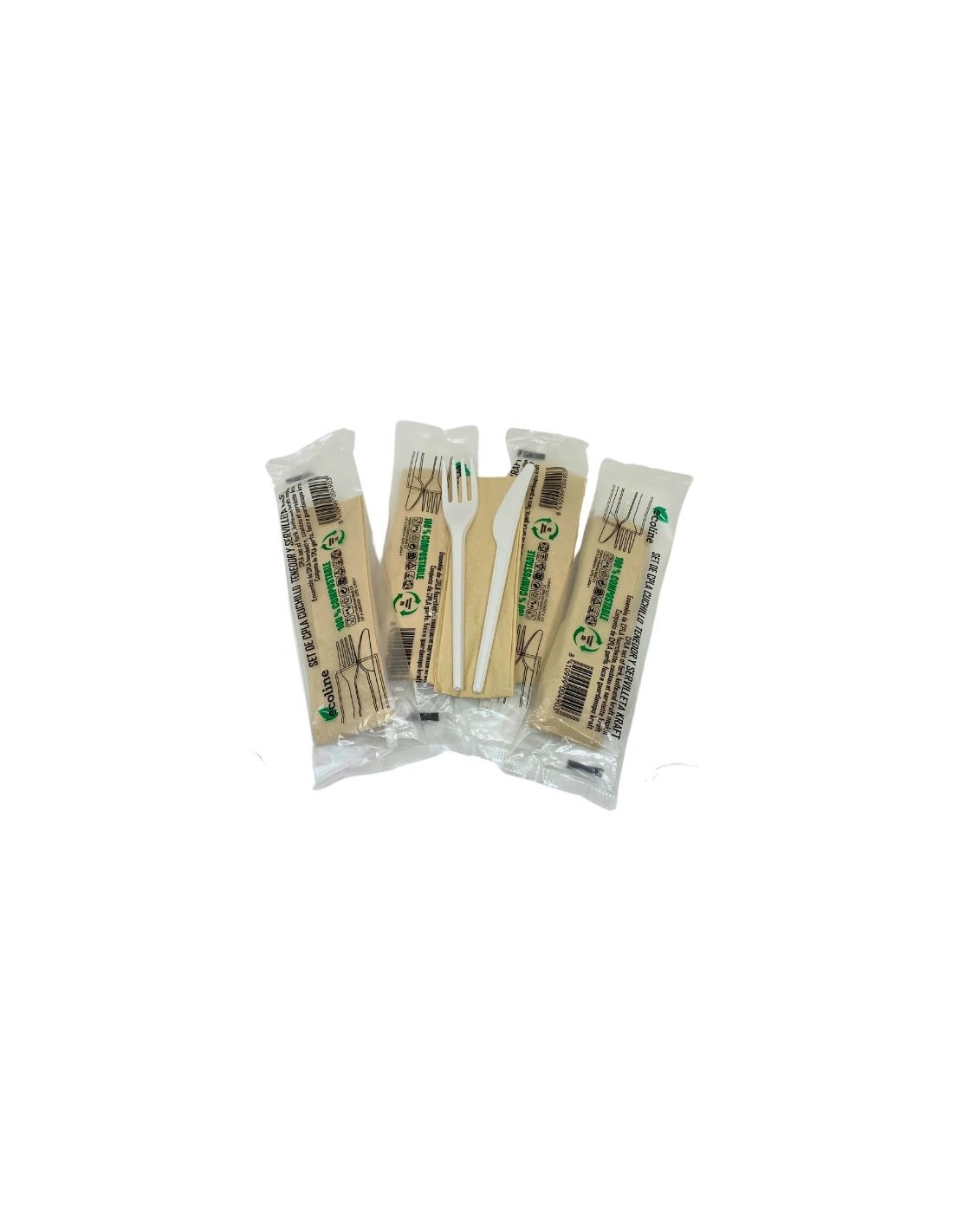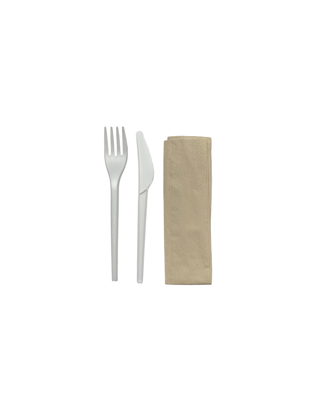 El Pack Bis CPLA + servilleta compuesto por tenedor y cuchillo reutilizables de CPLA (ácido poliláctico cristalizado) y servilleta natural. Pack individual muy higiénico ideal para comidas para llevar o eventos.