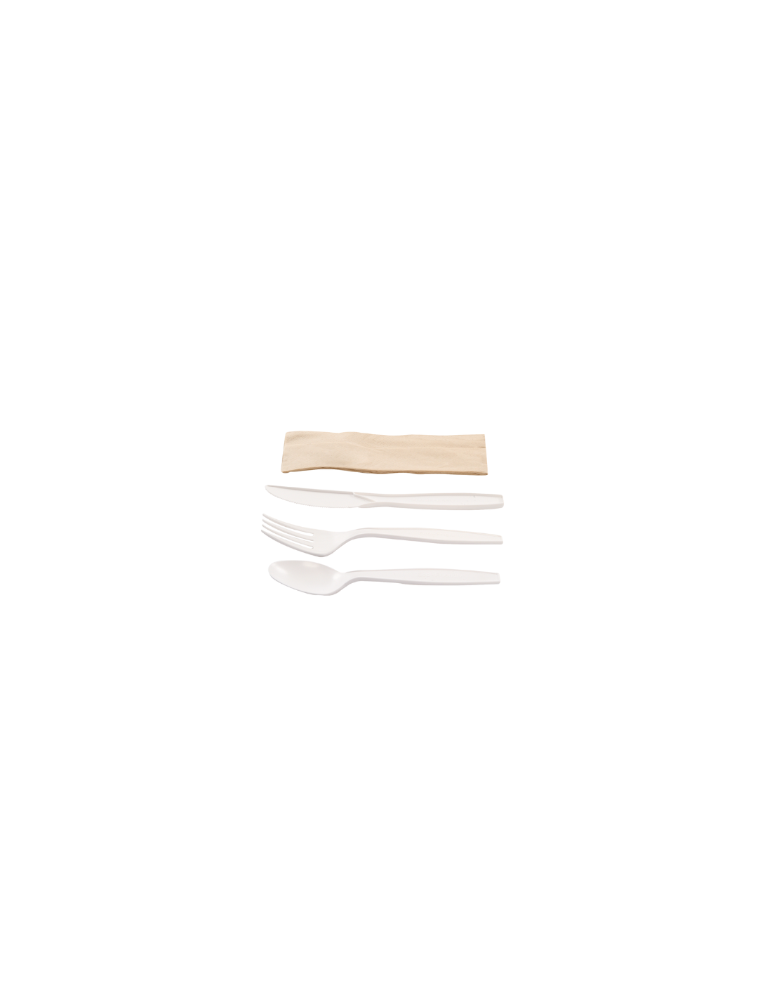 Pack Tris blancos de cubiertos + servilleta kraft (500 uds). Set ecológico, práctico e higiénico para servicios de hostelería, take away y eventos.