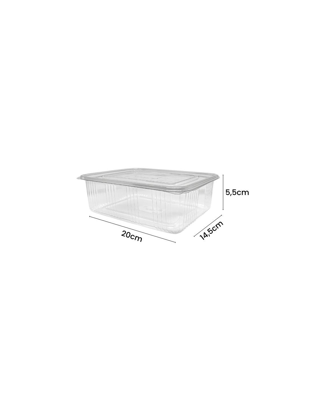 El envase de bisagra PET es un desechable, resistente, apto para congelación y gracias a su tapa con pestañas de cierre, hermético y seguro. Perfecto para transporte.