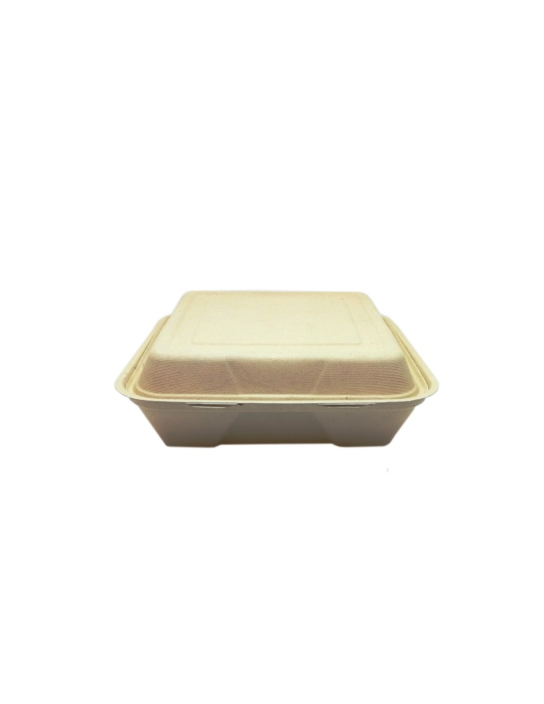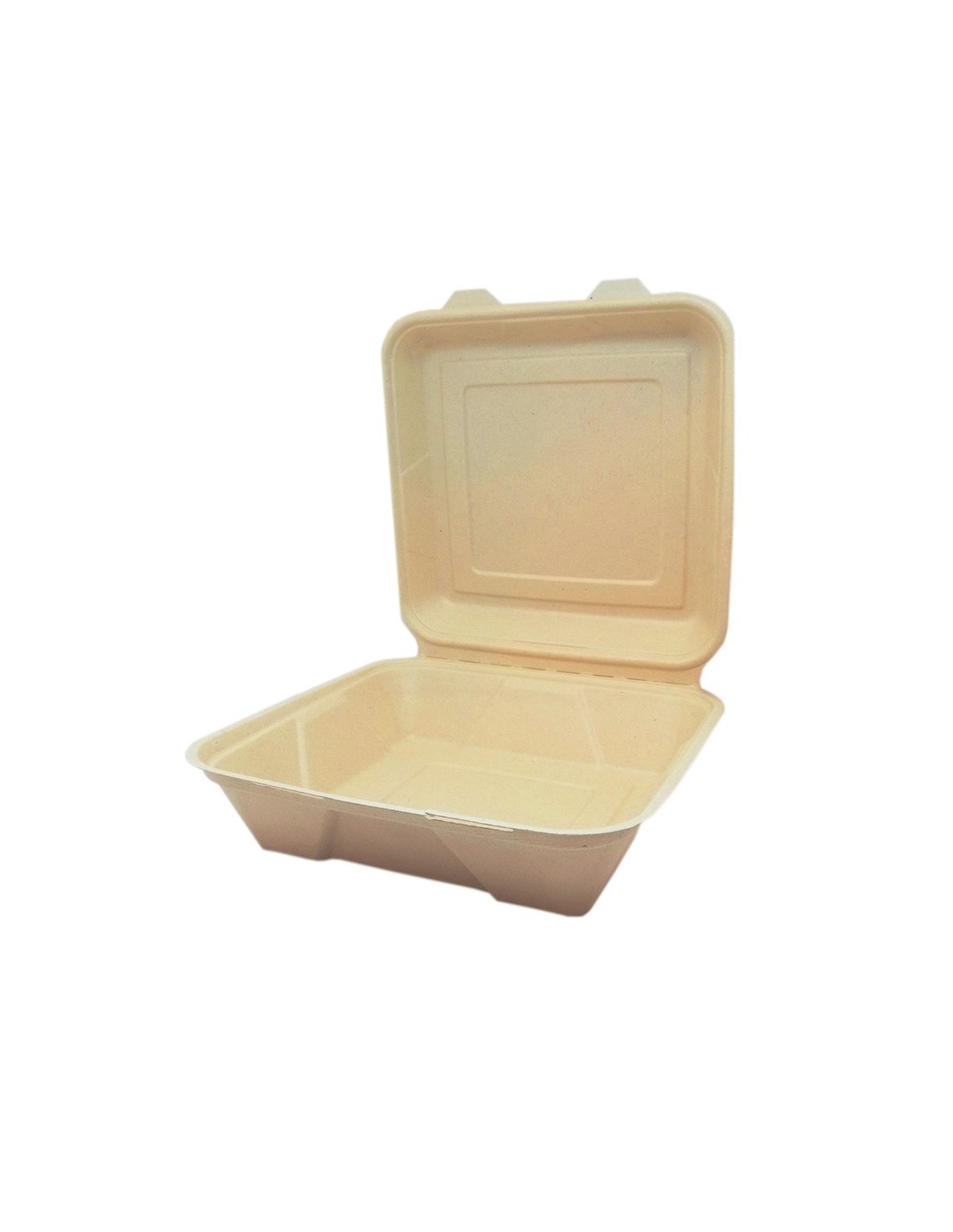 El Envase con tapa bisagra de bagazo 235x235x85mm (50uds) es un envase de compartimento único fabricado en bagazo, un material totalmente natural, biodegradable y desechable, que no transfiere olores ni sabores a sus alimentos, convirtiéndolo en una de las mejores opciones para los servicios de cáterin, take away o colectividades.