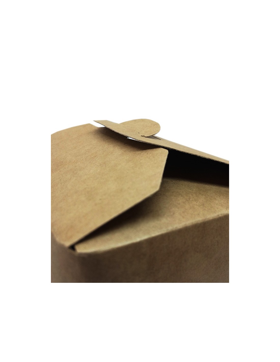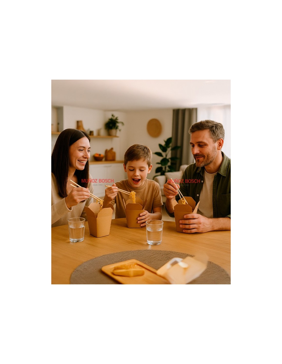 El envase multifood (500uds) está fabricado con cartón Kraft 100% reciclable y 100% higiénico. Su capa antigrasa protege su contenido (arroces, pastas, fritos) y evita fugas, gracias a su parte superior, que cierra en forma de sobre y cumple función de tapa, evitará que su contenido se pierda en el transporte y ayudará a conservar la temperatura de los alimentos que contenga y a la vez permitirá la salida de vapores para que el alimento no se reblandezca y conserve su aspecto original.
