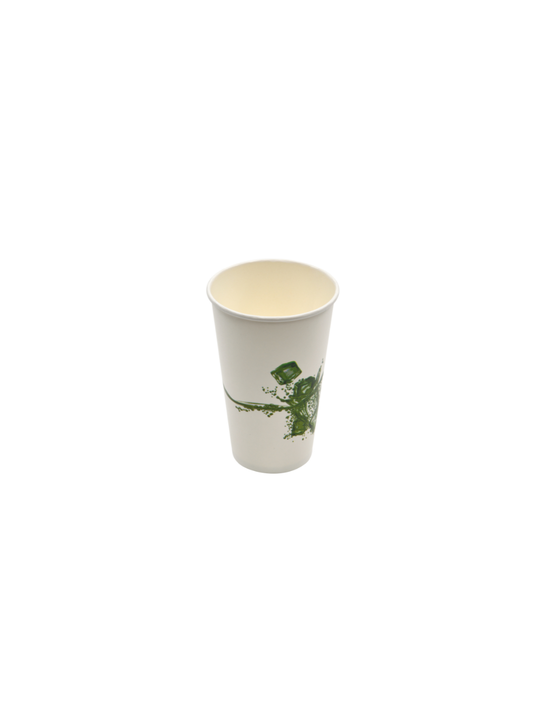 Vaso de cartón blanco con estampado hoja. Diseñado para bebidas frías y calientes, ideal para hostelería, take away y eventos profesionales.