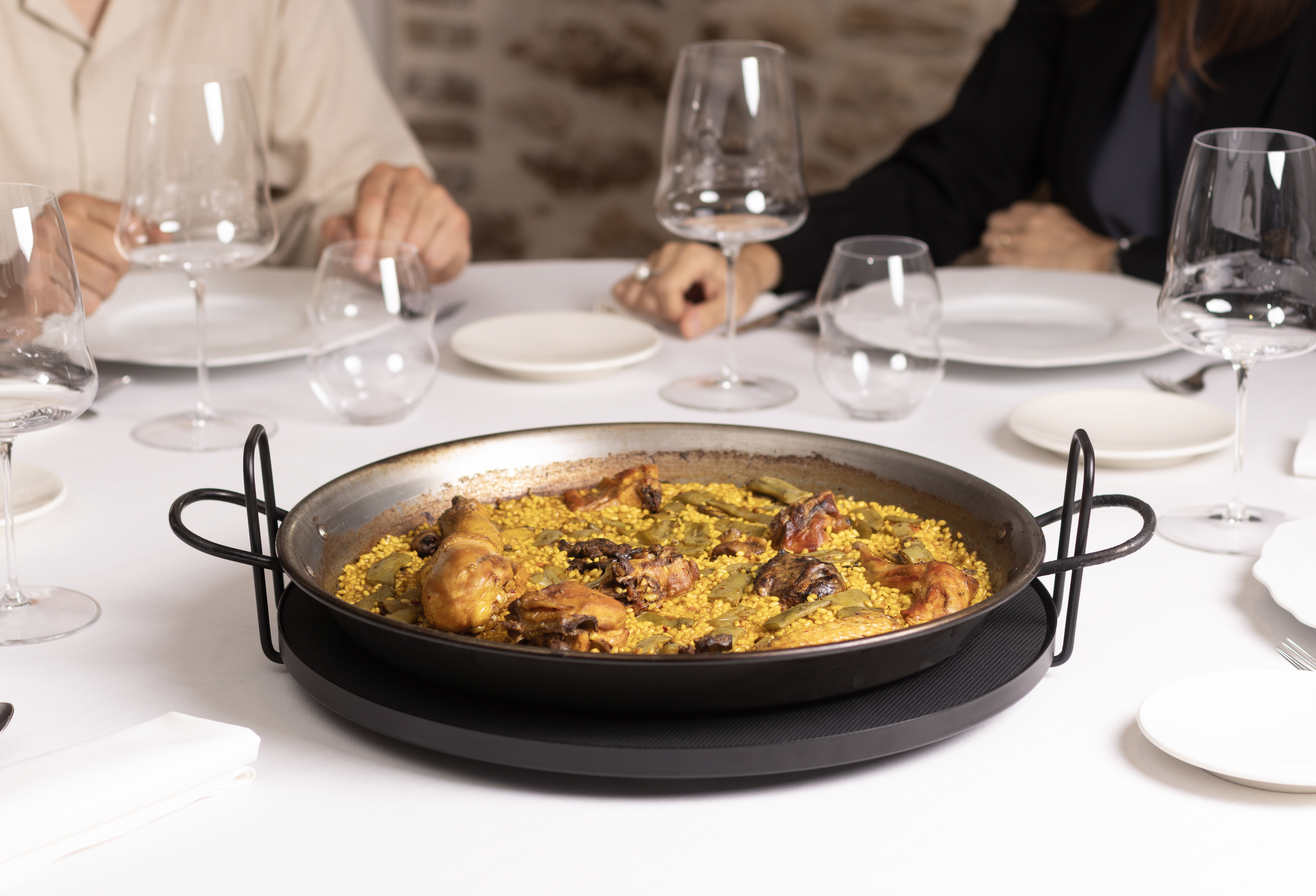 Permite servir la paella directamente en mesa con estabilidad y seguridad.