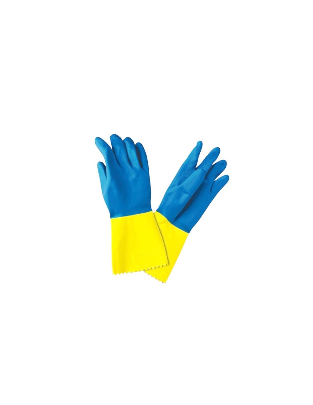 Los guantes bicolor azules y amarillos de látex natural y neopreno. Ideales para hostelería, limpiezas e higienes industriales, manipulación de líquidos y alimentos.