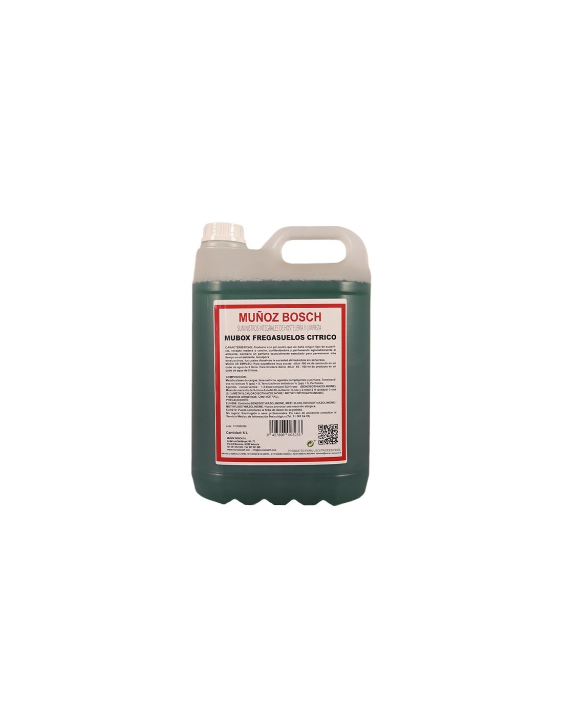 El Mubox fregasuelos cítrico garrafa 5L limpia, abrillanta y perfuma con aroma duradero. Alto rendimiento para uso profesional.