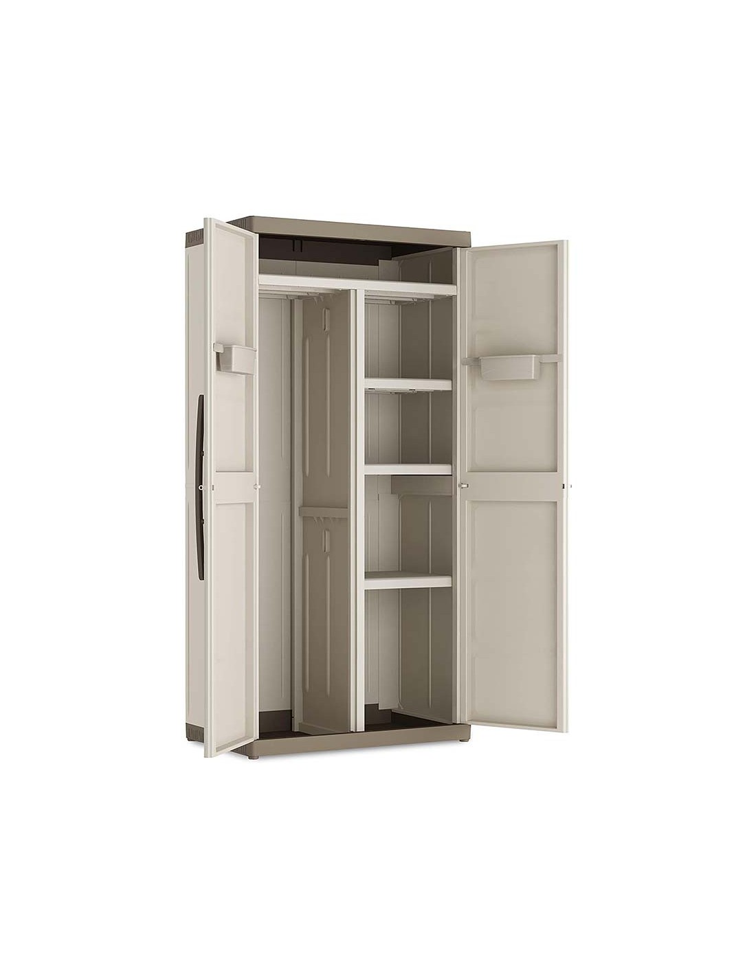Este armario de terraza escobero está dividido en dos compartimentos independientes le permite almacenar en un lado sus escobas, fregonas o cubos y en el otro, con balas regulables en altura sus productos más empleados, soportando cada una hasta 25Kg. También tiene una balda superior que recorre todo el ancho del armario para aumentar su capacidad de almacenaje.