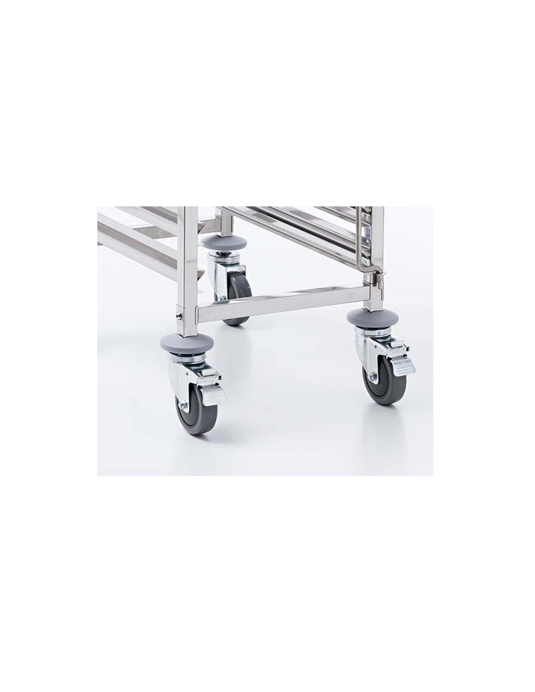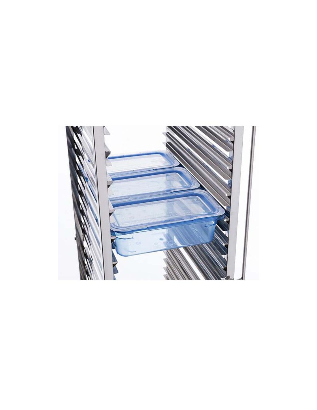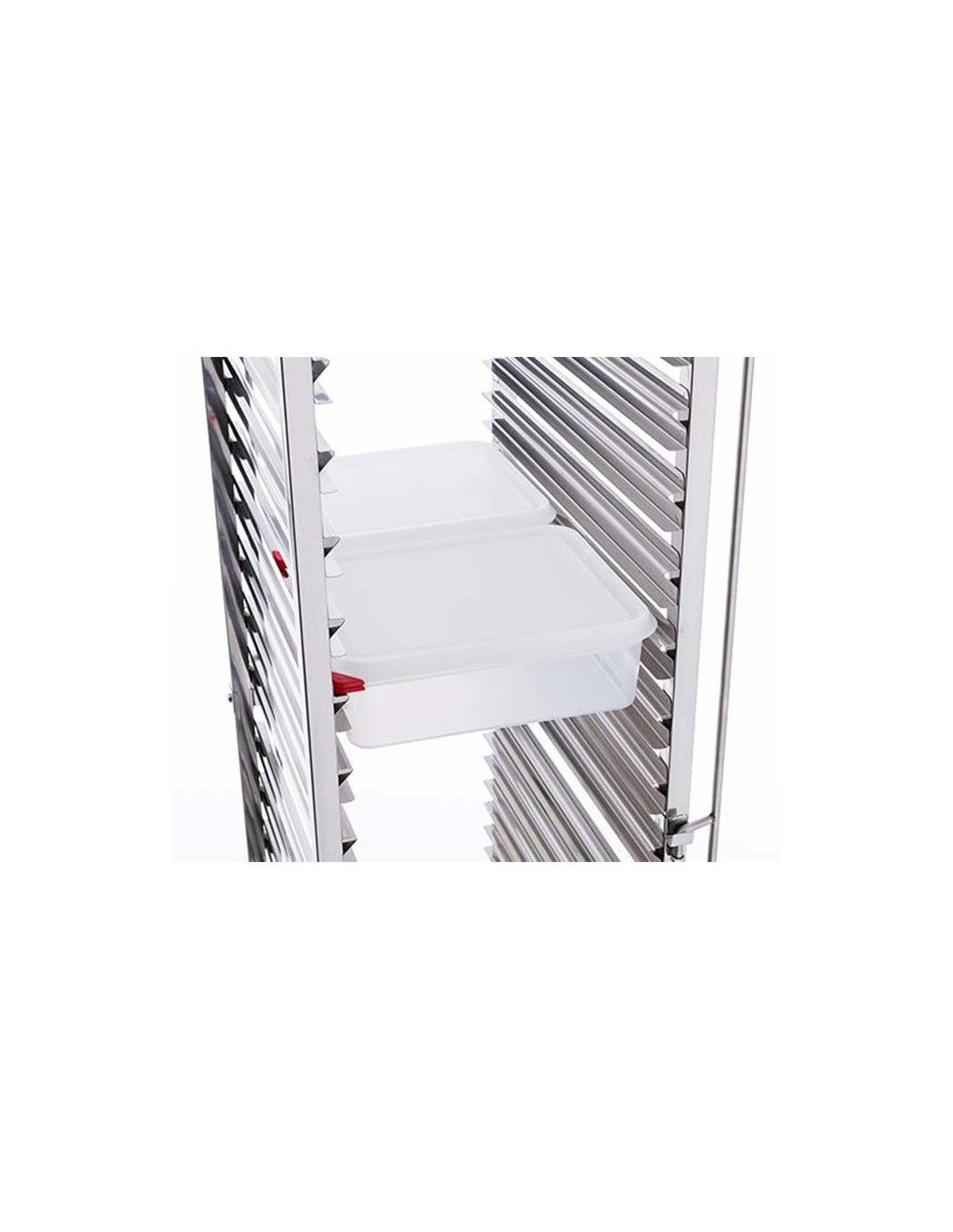 Este carro para cubetas está fabricado en acero inoxidable de la más alta calidad, con 18 raíles para depositar las bandejas y con una resistencia de hasta 112 kg.