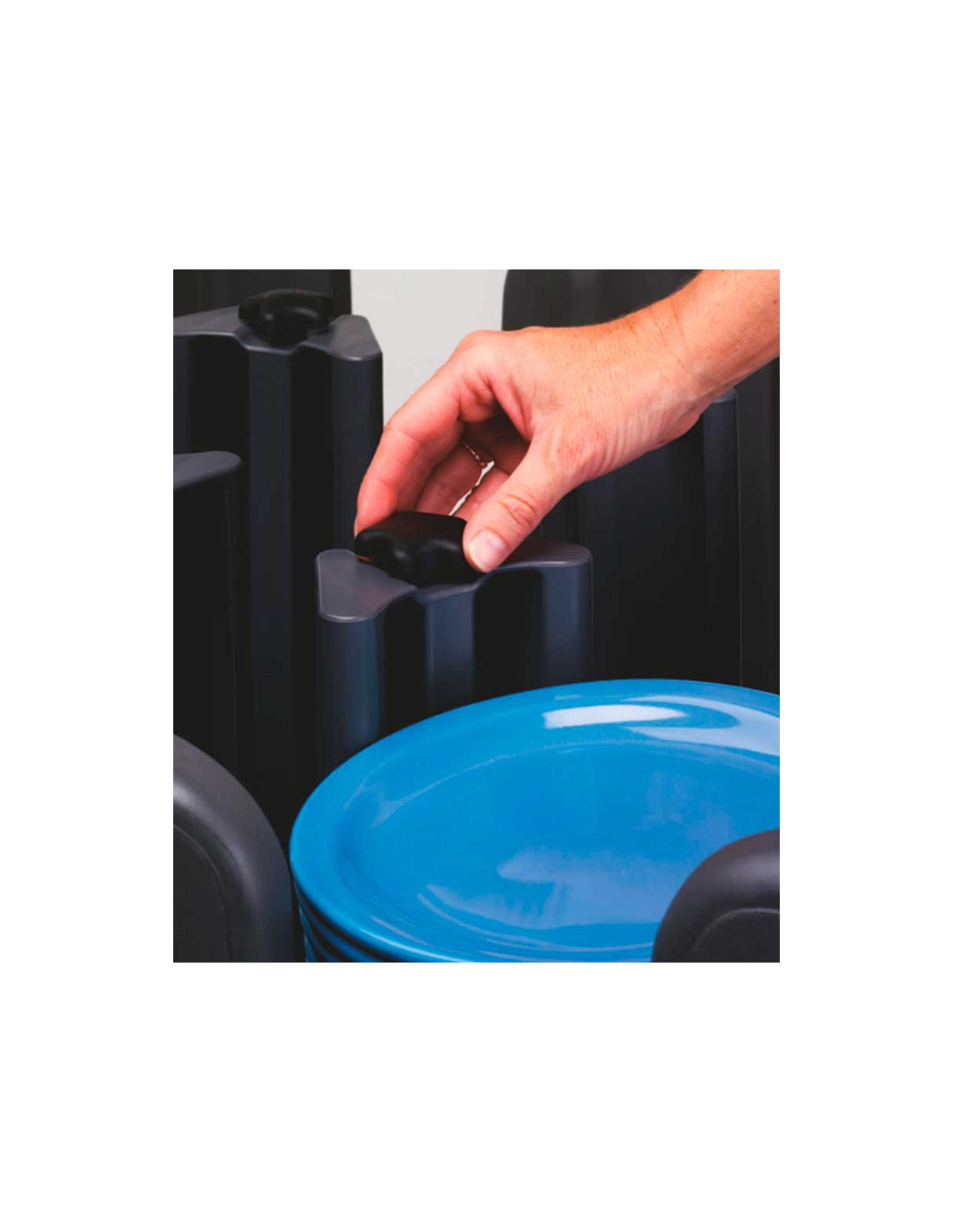 Este carro facilita el estocaje, transporte y descarga de platos de forma ergonómica y segura. Cada columna tiene capacidad para 40 a 55 platos, en función del tamaño, lo que lo convierte en una opción compacta pero altamente funcional para espacios donde la optimización es clave.