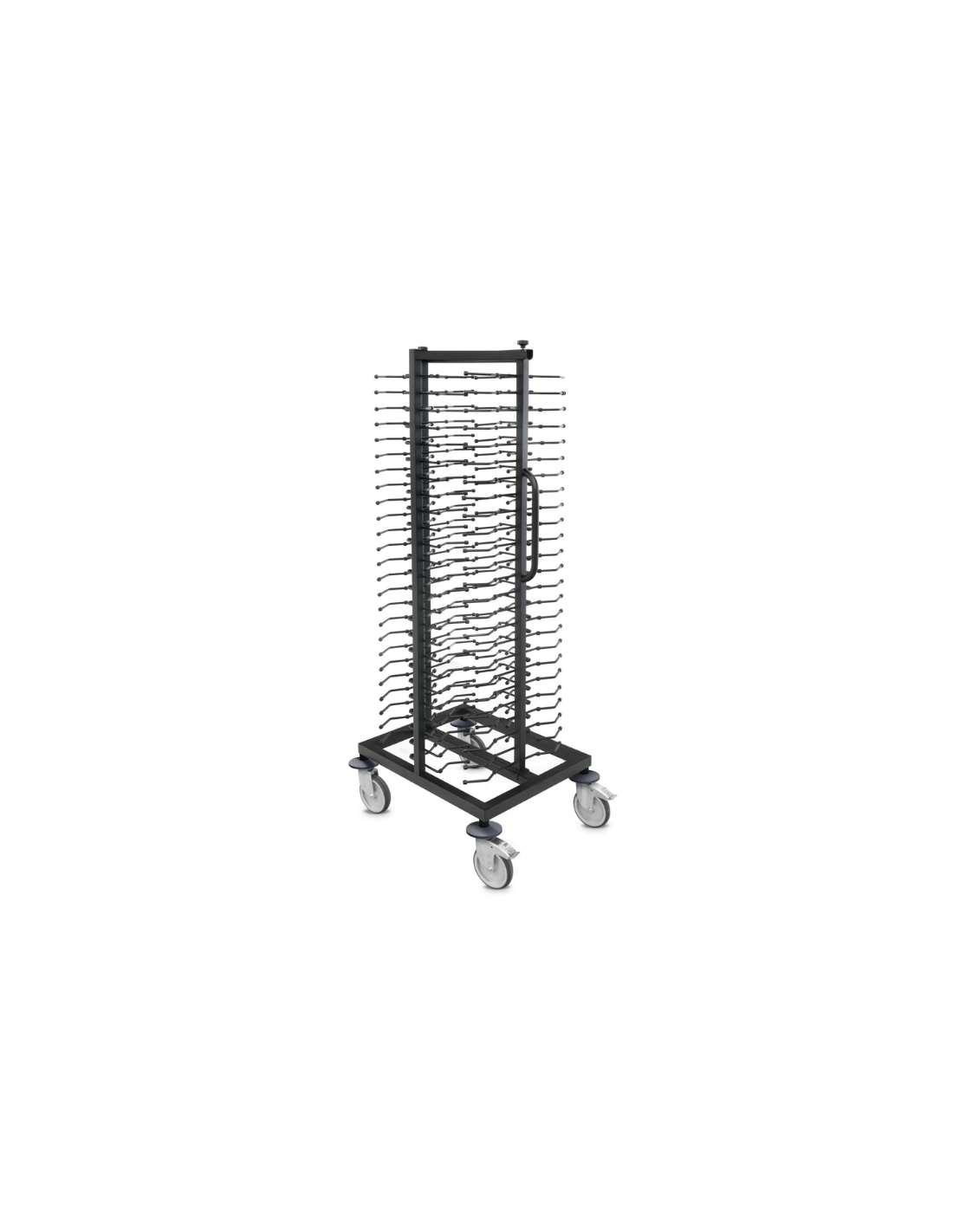 Su sistema ajustable permite combinar distintos tamaños de platos en un mismo carro, adaptándose a platos de hasta 34,5 cm de diámetro, lo que aporta una gran versatilidad operativa. Con capacidad para 100 platos, este carro para hostelería facilita el almacenaje y el transporte ordenado, evitando daños y optimizando el espacio.
