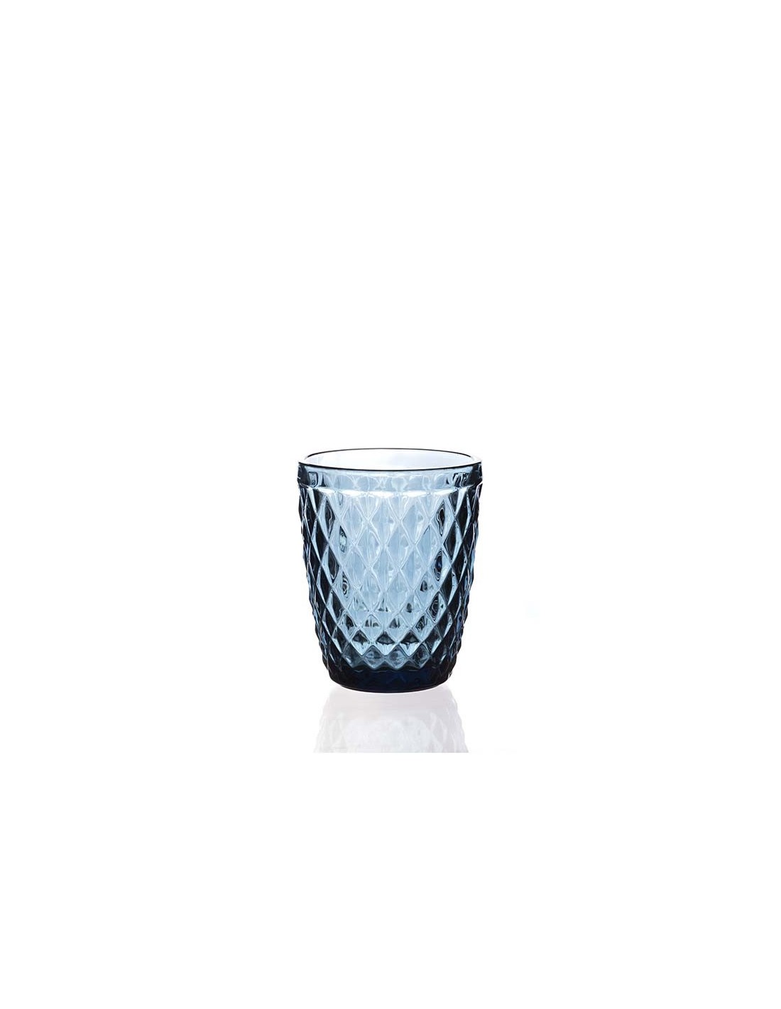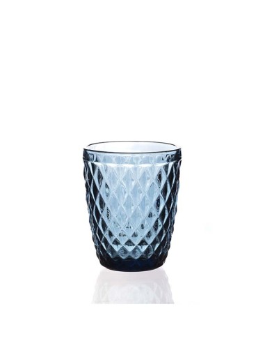 Vaso bajo vidrio relieve vintage azul 27cl es de diseño colorido y paredes grabadas con formas geométricas para vestir y dar alegría a sus mesas.