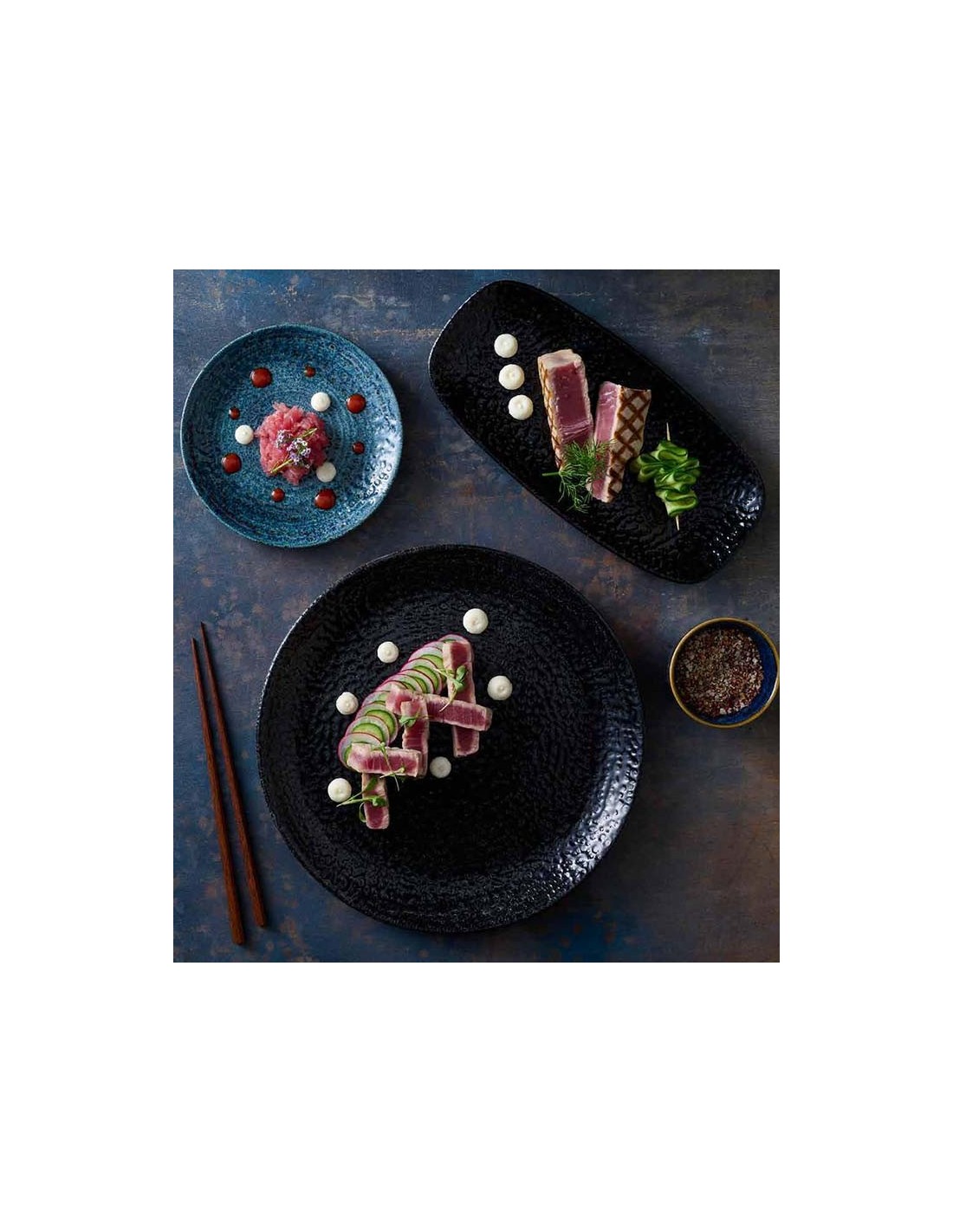 El plato negro coupé Homespun chroma Carbon de porcelana super vitrificada es de diseño elegante, resitente, duradero y perfecto para uso intesivo y continuado. Apto para lavavjillas y microondas.
