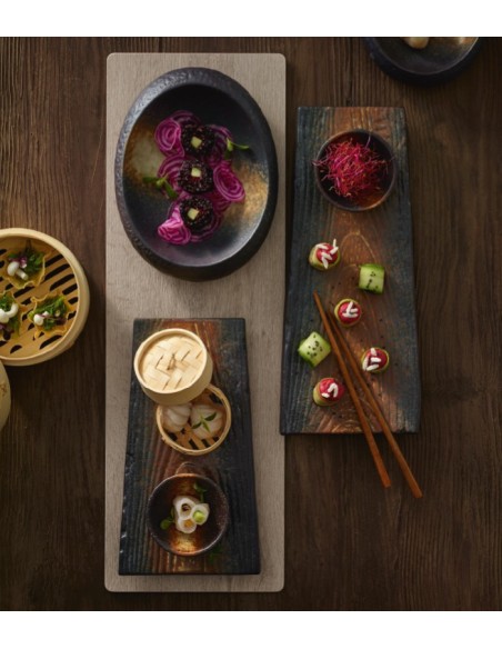 El bol oval de la colección Terra de Playground-Schönwald es un bol con un diseño rústico fabricado con un gres esmaltado con un acabado terroso y vidrioso combinado con una interpretación a madera y tierra.